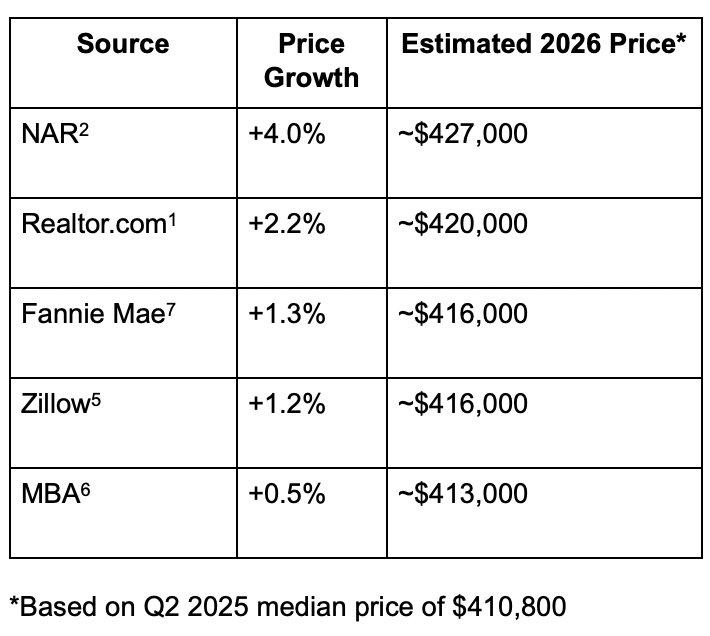 All major forecasters predict continued home price appreciation in 2026, though projections cluster in a relatively narrow band between 0.5% and 4% growth.